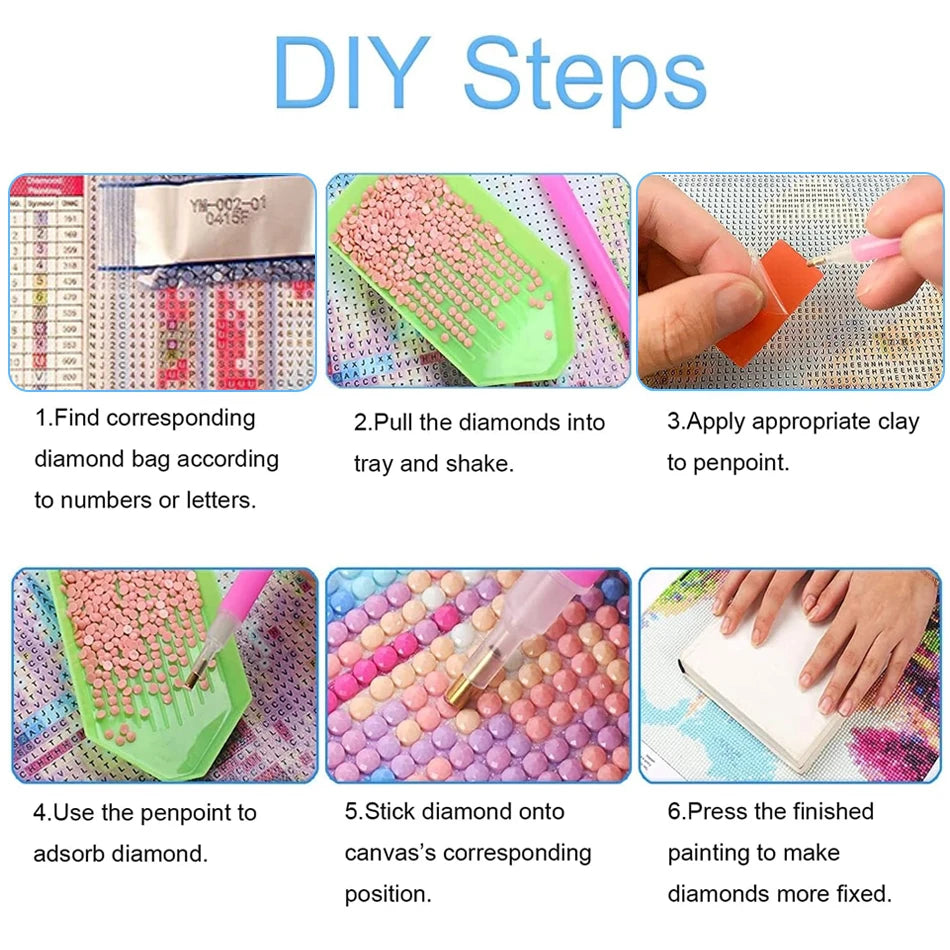 - 20-60 x Individually Labeled Diamond Packs – These resin rhinestones, available in a variety of colors, are the heart of your artwork. The number of packs corresponds to the number of colors in your chosen design, varying with the size and complexity of the painting.