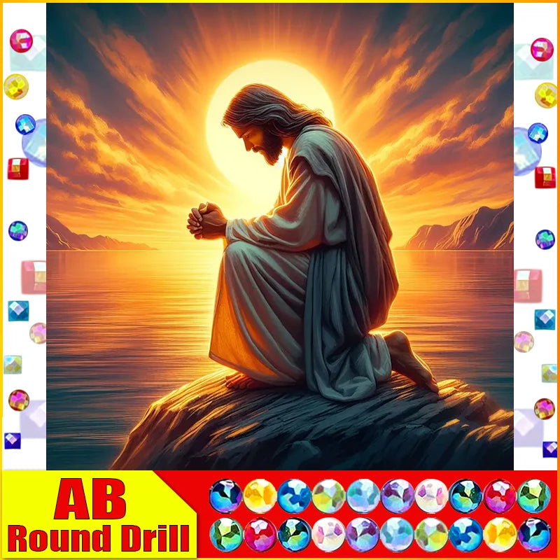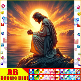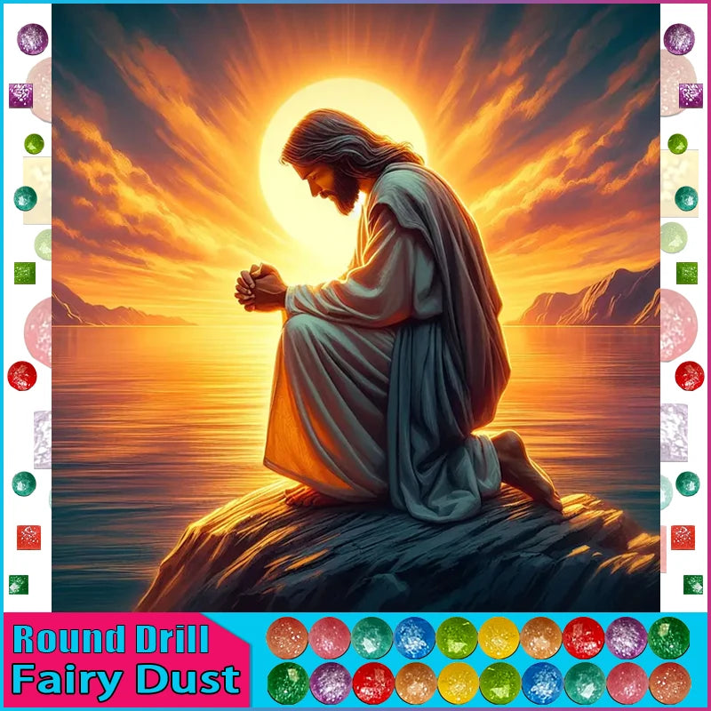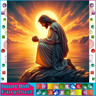 Jesus Kneeling In Prayer On A Rock Basking In Golden Sunlight - Square/Round Fairy Dust or Aurora Borealis Diamonds - DIY Religious Diamond Painting Kit - Enjoy The Fun And Relaxation Of Creating This Religious Diamond Art Featuring A Brilliant Depiction Of Jesus Christ! Add This To Your DIY Diamond Art Collection Today! Remember...The Larger The Canvas The Greater The Detail In The Finished Product!