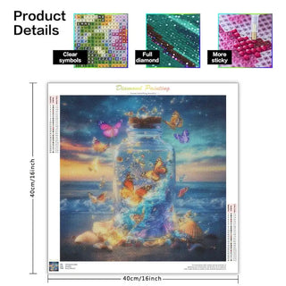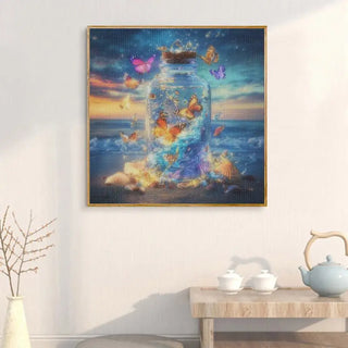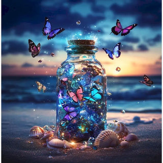 Beautiful Ocean Design Featuring A Clear Glass Jar In The Sand Surrounded By Shells And Butterflies - Full Square/Round Drill 5D Diamonds - Full Pasting Area In Several Canvas Sizes - This DIY Scenic Diamond Painting Will Bring The Beauty Of The Sea Into Any Room! Choose Your Favorite Of 2 Designs!