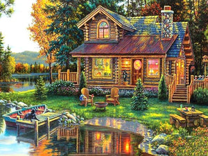 Family Cottage In The Autumn Forest Resting On A Still Lake - Scenic Rhinestone Embroidery Full Square / Round Drill 5D Diamonds - DIY Scenic Diamond Painting Displaying Amazing Home And Water View Scenery - Available On Full Pasting Area In Several Painting Canvas Sizes - DIY Diamond Kit - Perfect For Any Home Or Office Decor