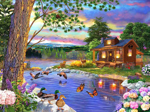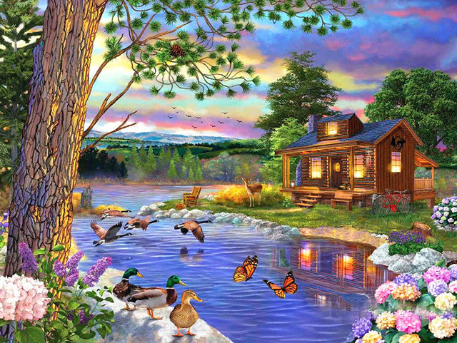 Butterflies And Ducks Frollick Water Side Across From A Tiny Rural Cabin - Scenic Rhinestone Embroidery Full Square / Round Drill 5D Diamonds - DIY Scenic Diamond Painting Displaying Amazing Home And Water View Scenery - Available On Full Pasting Area In Several Painting Canvas Sizes - DIY Diamond Kit - Perfect For Any Home Or Office Decor